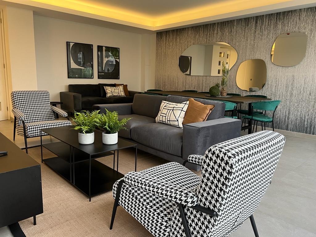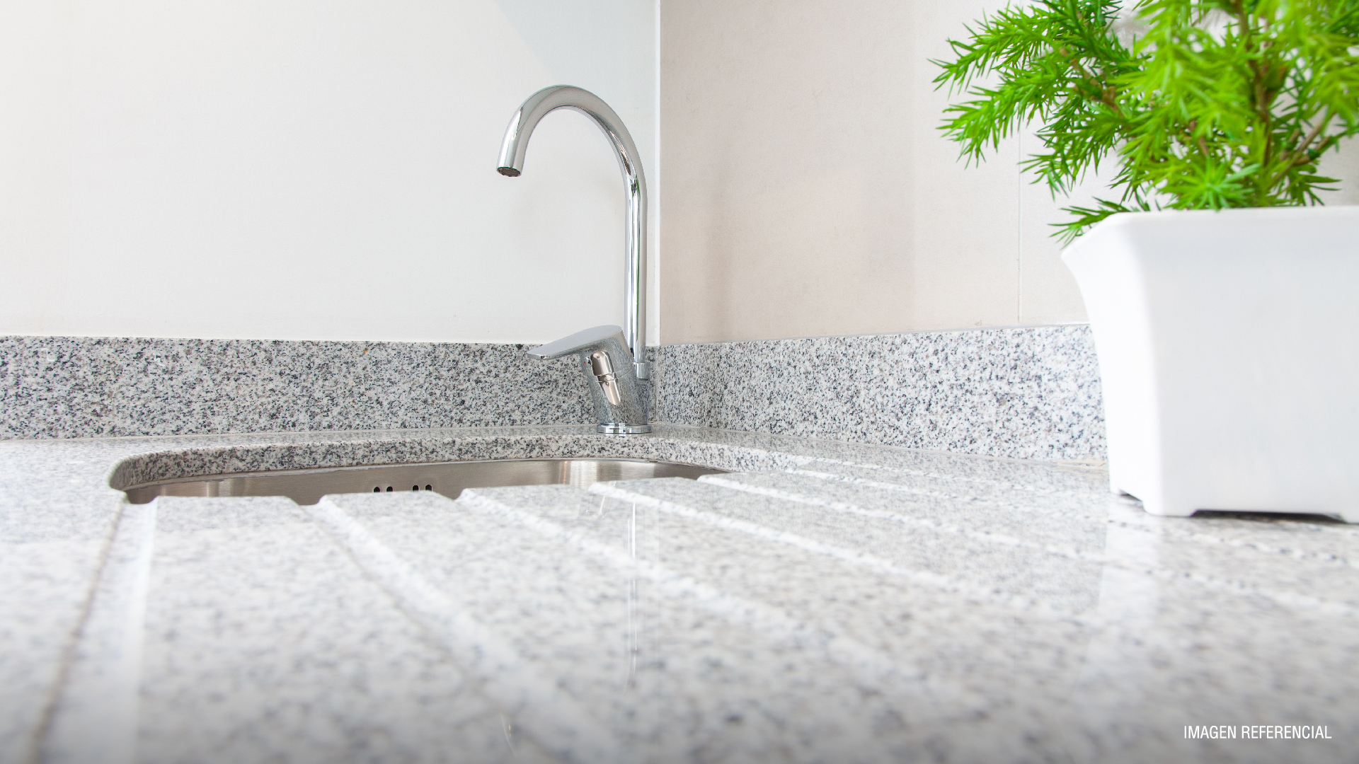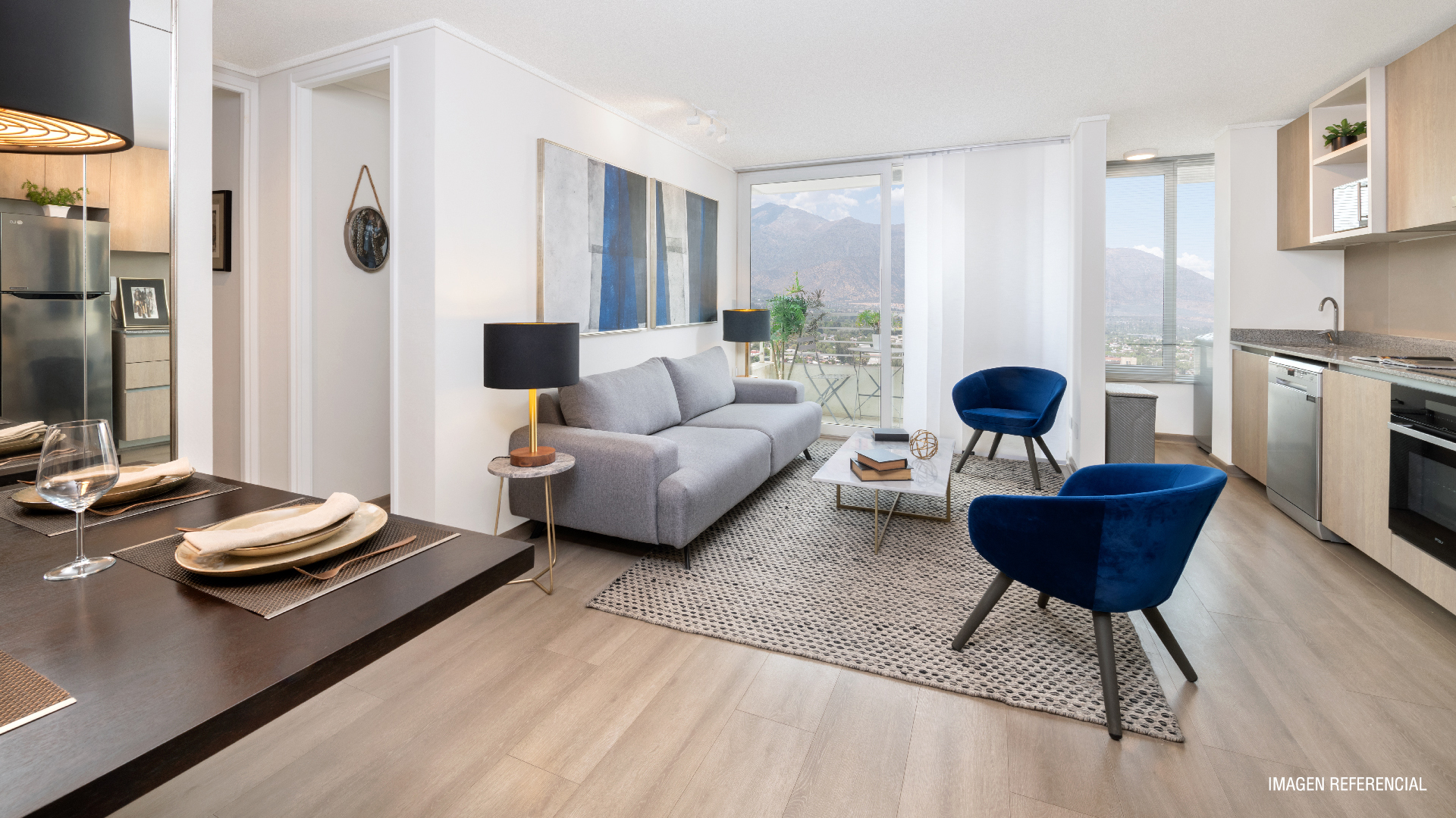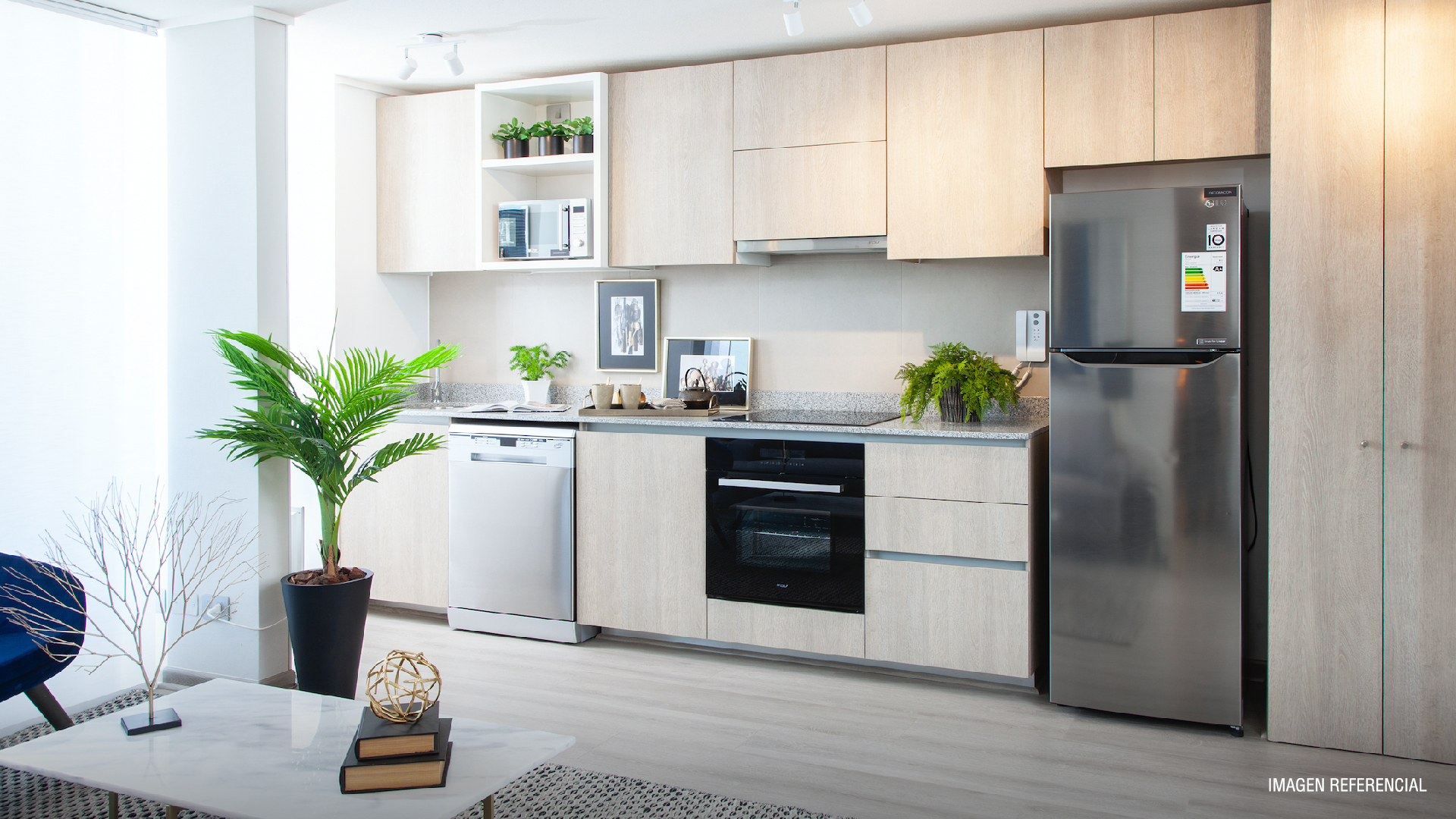 Ventanas de termopanel con marco de PVC, Piso fotolaminado, Baño principal con mampara de cristal, Cocina equipada con horno, encimera y campana, Cubierta de cocina en granito, Vanitorio con cubierta de mármol.